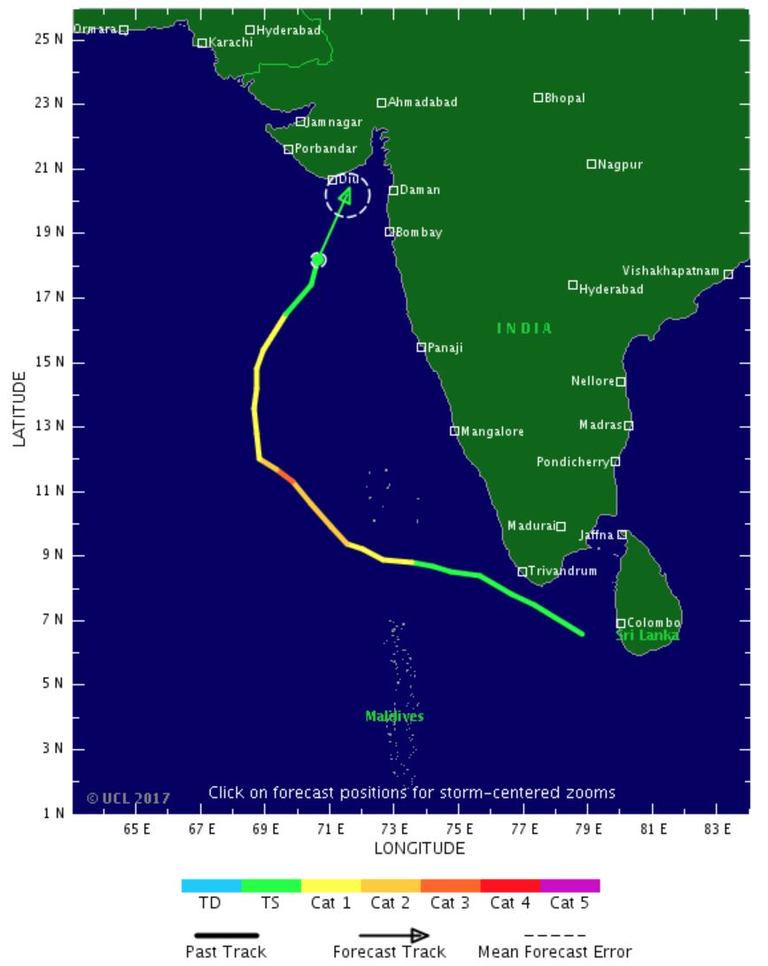 Par la suite le cyclone devrait perdre en puissance à mesure qu'il poursuit son chemin vers le Nord. Il pourrait terminer sa vie sur le centre Ouest de l'Inde ou le Sud du Pakistan le 06 décembre prochain sous la forme d'un cyclone de catégorie 1 ou de tempête tropicale.
