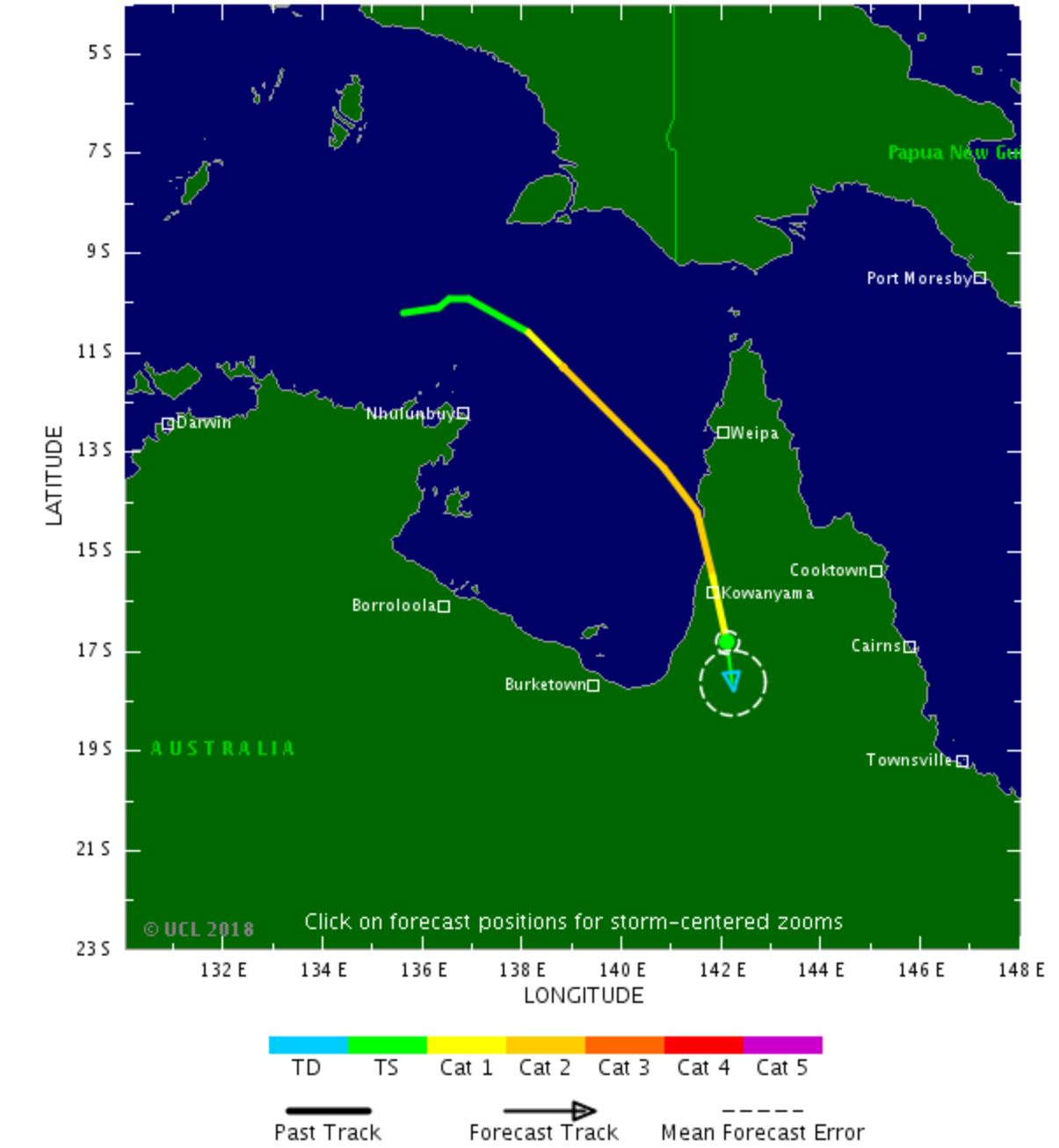 Le cyclone touchera le Nord-Ouest du Queensland samedi, en longeant la côte est du Golfe de Carpentaria. Les villes de Pormpuraaw et de Kowanyama devraient être touchées par des vents très puissants et des pluies diluviennes susceptibles de causer des inondations. Par la suite, dans la nuit de samedi à dimanche le cyclone devrait affecter les secteurs de Karumba, Normanton et Carpentaria avec des vents soufflant à 180 km/h. Outre, les vents, on attend des cumuls allant de 300 à plus de 500 mm en 72h .