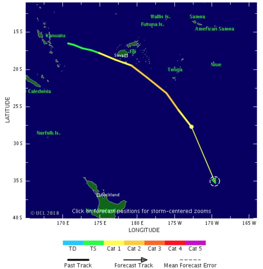 10/04: Actuellement, les vents moyens sont de l'ordre de 120 à 130 km/h avec des rafales proches de 185 km/h et une pression en son centre de 970 hPa. Il se situe à moins de 100 km des côtes sud de Fidji.