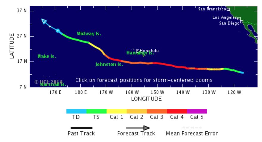 Par la suite Hector devrait poursuivre sa route à l'Ouest pour atteindre l'archipel des îles Johnston en soirée du 10 août. A cette échéance le système devrait avoir légèrement perdu de sa vigueur et être classé en catégorie 2 (vents à 165 km/h).