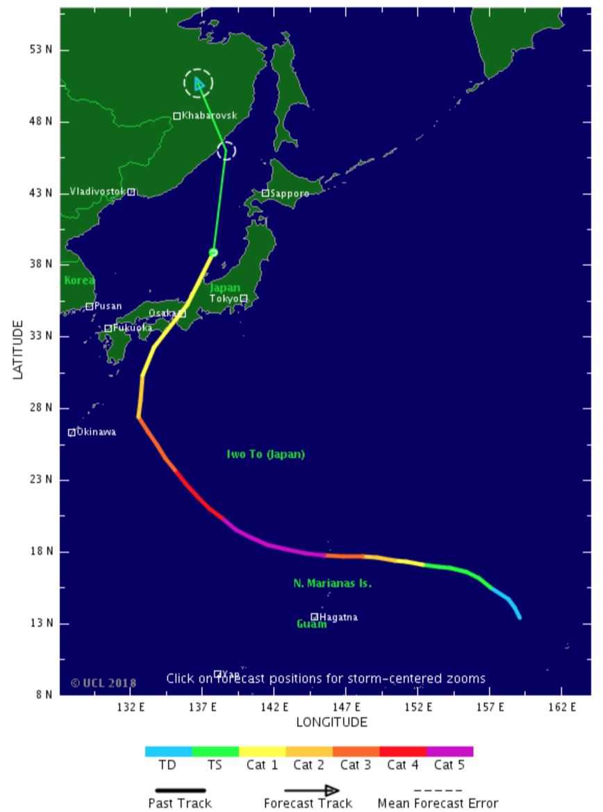 Le typhon pourrait potentiellement toucher l'Ouest du Japon le 04 ou le 05 septembre. A cette échéance, Jebi serait un typhon de catégorie 3 ou 2 avec des vents supérieurs à 150 km/h et de très fortes pluies.