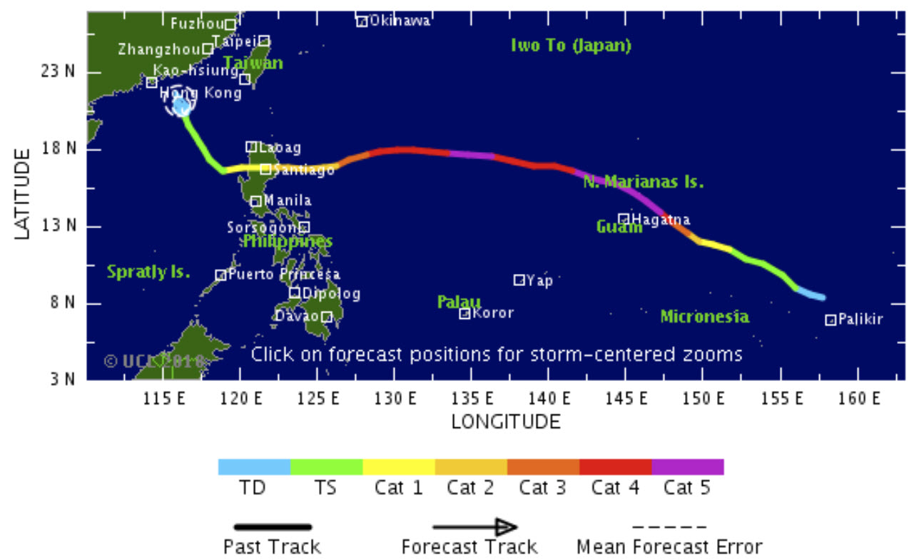 Les tendances de trajectoire continuent de privilégier un déplacement sur un cap ouest à ouest nord-ouest. C'est une trajectoire qui risque donc de rapprocher le typhon des terres habitées situées à l'extrémité occidentale du pacifique. La zone potentiellement menacée est encore assez large et va du nord des Philippines à Taïwan. Le système pourrait transiter dans cette zone dans le courant de la semaine prochaine, ce qui laisse encore largement de temps pour voir venir et affiner les prévisions.