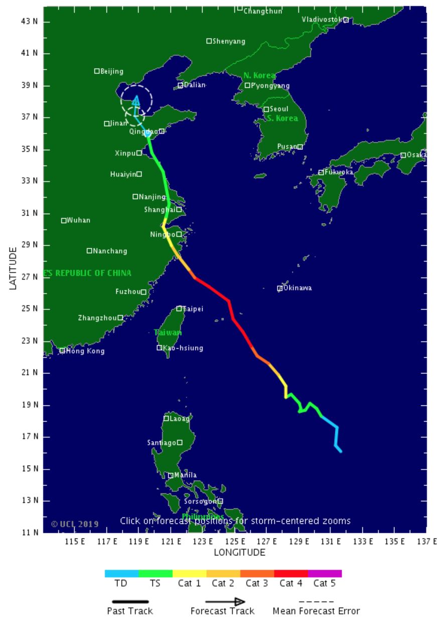 Un renforcement supplémentaire est prévu de mercredi à vendredi, permettant à Lekima de devenir un typhon puissant et de vents égaux à un ouragan de catégorie 2 dans les océans Atlantique et Pacifique.