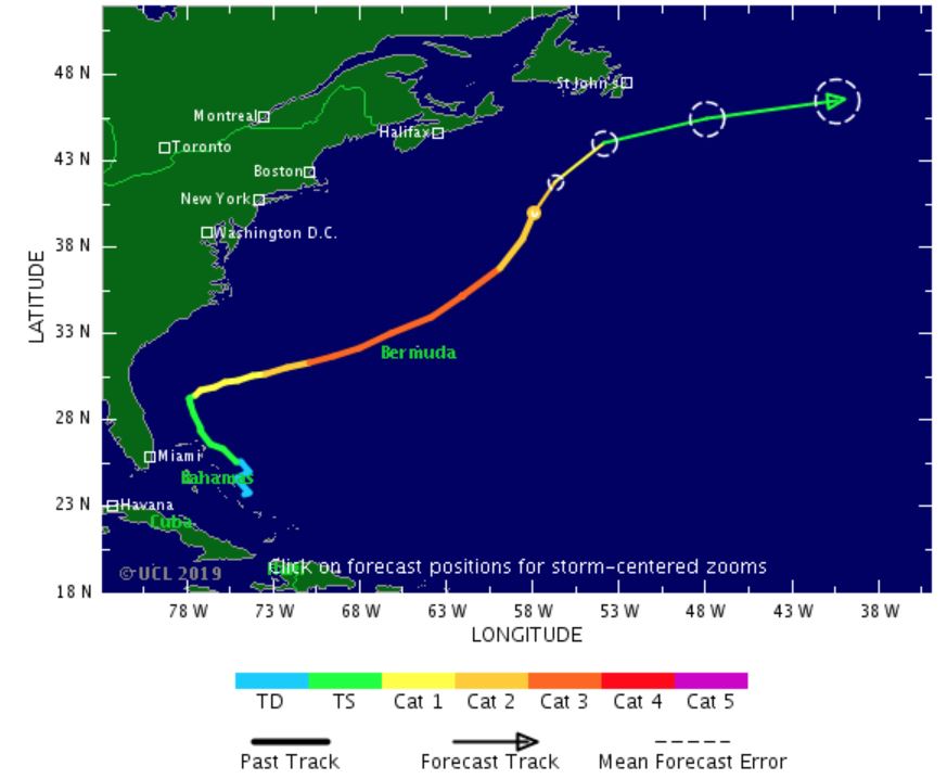 13/09: Une dépression tropicale située sur l'archipel des Bahamas déjà meurtrie par l'ouragan Dorian est sous surveillance. Le phénomène qui est encore faiblement organisé, a le potentiel pour se creuser significativement au cours des prochaines 24 à 48h. Il y a donc une possibilité qu'il puisse devenir la future tempête Humberto.