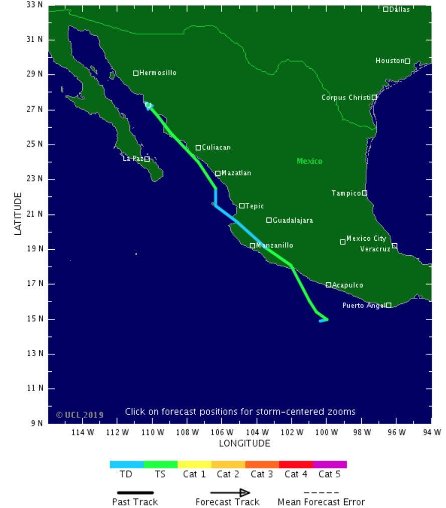 La tempête tropicale Narda qui s'est formée ce weed-end au large immédiat d'Acapulco sur la côte Pacifique du Mexique a perdu de la vigueur en touchant terre mais devrait de nouveau se renforcer en tempête tropicale après avoir dépassé la station balnéaire mexicaine de Puerto Vallarta .