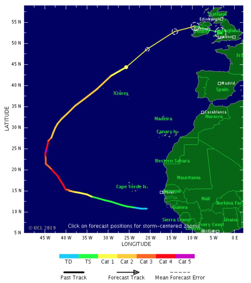 La trajectoire potentielle de Lorenzo après son passage aux Açores est très incertaine. Cependant, Lorenzo devrait terminer sa course sous la forme d'une tempête tropicale sur l'Ouest de l'Irlande où des vents violents et de fortes pluies sont attendus.