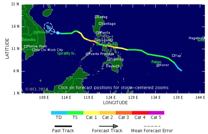 Phanfone devrait traverser le centre de l'archipel Philippin avant de retrouver la mer des Philippines en poursuivant sa route à l'Ouest-Nord-Ouest en s'affaiblissant. Il pourrait toucher le centre du Vietnam sous la forme d'une tempête tropicale ou d'une dépression tropicale le 29 ou le 30 décembre.