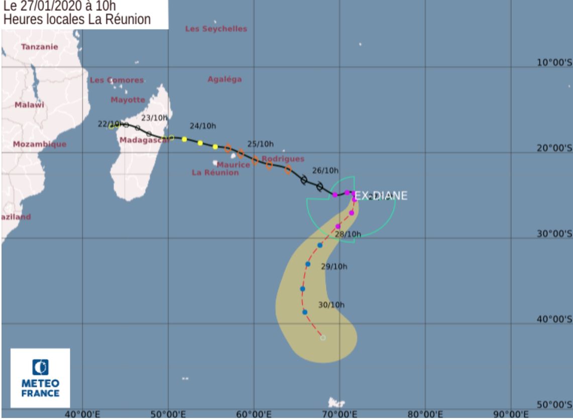 Au cours de cette journée de Vendredi, le phénomène devrait continuer de se renforcer très lentement, profitant de conditions environnementales plutôt favorables. Le stade de Tempête Tropiale Modérée pourrait être atteint ces prochaines heures. Le phénomène sera nommé Diane par Madagascar si les critères de baptême sont atteint à l'Ouest de 55E ou par Maurice si à l'Est de 55E. Concernant la trajectoire, le système maintient un déplacemet Est à Est Sud-Est durant toute sa traversée des Mascareignes.
