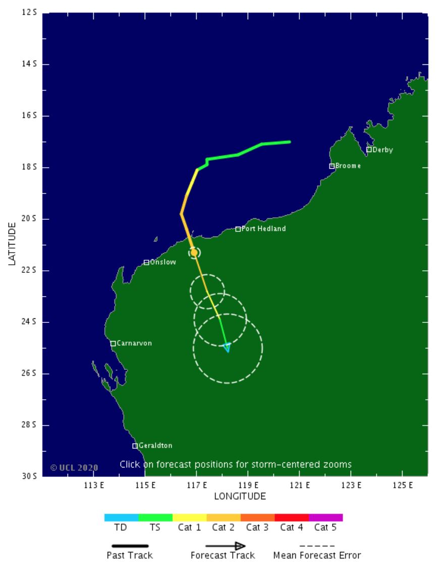 Jusqu'à présent, Damien s'est déplacé en direction de l'Ouest à Ouest Sud-Ouest sous l'effet de la dorsale subtropicale. À compter d'aujourd'hui, l'arrivée d'un thalweg modifie la trajectoire qui s'oriente vers le Sud. Sur ce cap, le cyclone se dirige droit vers les côtes du Pilbara avec un impact inéluctable prévu Samedi. Il ne reste plus qu'à déterminer la zone d'atterrissage exacte et le timing. Pour l'heure, le point d'impact se situerait dans le secteur Diamper, Karratha ou Wickham dans 24h.
