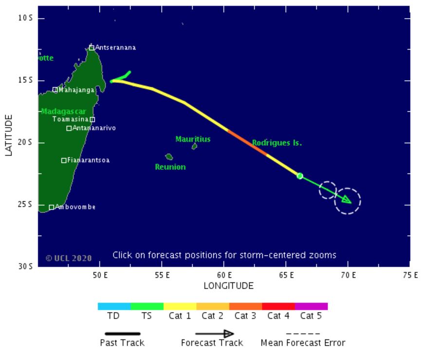 Dans son point de 10h (6z), la trajectoire du CMRS de la Réunion se rapproche des modèles IFS et GFS. Les prévisionnistes du centre des cyclones envisagent un passage entre Maurice et Rodrigues, estimé à Mardi matin. À une échéance aussi élevée, la marge d'erreur dépasse largement les 200 km.