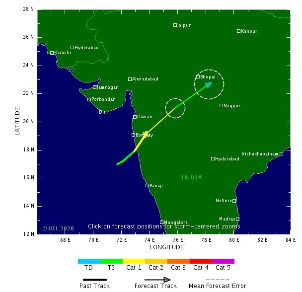 Un lent développement est attendu au cours des prochaines 24h. Dans le même temps, le système est prévu suivre une trajectoire orientée vers le Nord à Nord-Est, le long de la dorsale positionnée sur l'Inde. Sur cette trajectoire, un atterrissage sur les côtes occidentales indiennes est possible à proximité de Mumbai (Bombay) en journée de Mercredi. Étant donné le lent développement, le système pourrait toucher terre au stade de forte tempête tropicale ou à la limite du stade minimal de cyclone.