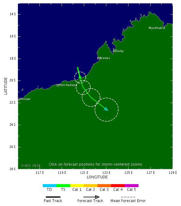 La tempête tropicale Fourteen s'est formée à proximité immédiate des côtes du Nord-Ouest de l'Etat de l'Australie Occidentale. Le système qui fait route au Sud-Sud-Est touche terre en générant des vents soufflant jusqu'à 90 km/h et de fortes pluies. Ces derniers sont susceptibles de provoquer des inondations.