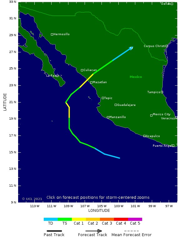 La Commission nationale de l'eau du Mexique, la CONAGUA, a averti dans un communiqué qu'"avant de toucher terre, il pourrait s'intensifier jusqu'à devenir un ouragan de catégorie 3" sur l'échelle d'intensité Saffir-Simpson en cinq étapes. Les ouragans de catégorie 3 transportent des vents soutenus de 179 à 208 km/h.