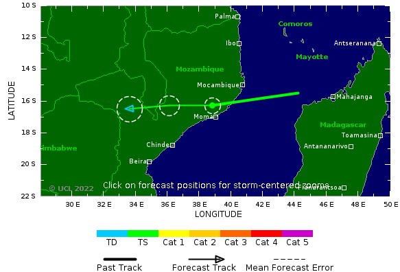 Le point d'atterrissage pourrait avoir lieu non loin d'Angoche. Des rafales pouvant atteindre les 120 km/h sont possibles dans les zones situées à proximité immédiate du point d'impact. Les modèles de prévision simulent des cumuls de précipitations significatifs sur les provinces mozambicaines de Nampula, le Nord du Quelimane et de Sofala y compris pour le Sud du Malawi.