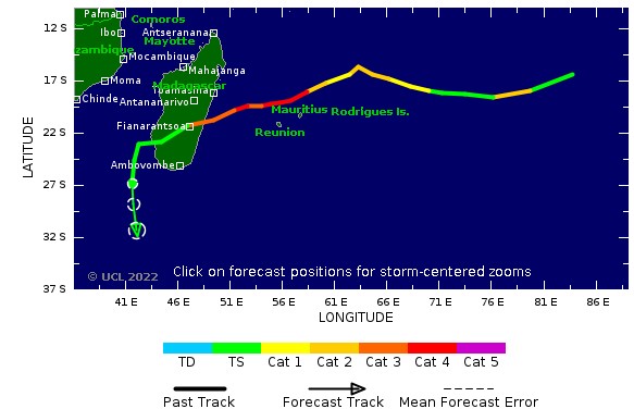 Son déplacement se fait désormais à 19km/h. Tout en se régénérant, le système, qui glisse en direction du Sud-Ouest, se rapproche de l'île Maurice et de La Réunion. Cette modification de trajectoire était prévue, reste à savoir de combien de degrés cela va modifier sa future "route".