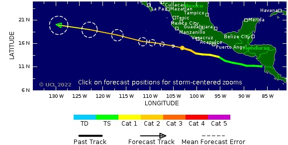 Par la suite, en retrouvant les eaux de l'océan Pacifique, le système devrait incurver sa trajectoire à l'Ouest-Nord-Ouest en se renforçant et en longeant les côtes de l'Amérique centrale. Il pourrait devenir un ouragan de catégorie 1 le 05 juillet lorsqu'il tangentera les côtes du Sud-Ouest du Mexique.