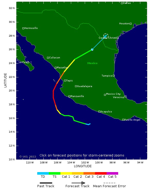 Selon les dernières modélisations, la dépression tropicale Nineteen-E pourrait rapidement se renforcer en parallèle aux côtes sud-ouest et centre-ouest du Mexique au cours des deux prochains jours. Elle devrait même atteindre le stade cyclonique le 22 octobre avant de toucher terre le lendemain avec une intensité d'ouragan de catégorie 2 (vents maximaux à 180 km/h) dans la région de Tepic