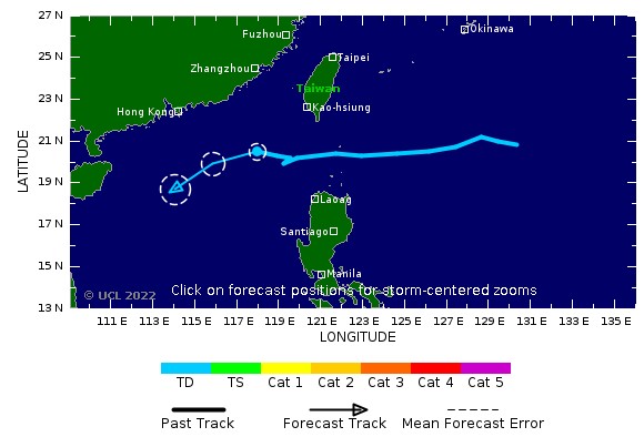 Les modèles de prévision indiquent que la tempête se transformera en tempête tropicale et se rapprochera du nord de la province de Batanes, en fin de journée. Après avoir transité par le détroit de Luzon, le système devrait entrer dans la mer de Chine méridionale début octobre 22 avant de se tourner vers suivre vers le sud-ouest vers le centre du Vietnam, en passant juste au nord des îles Paracels au début du 25 octobre.