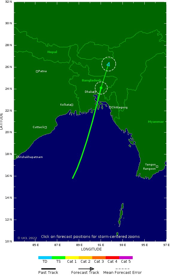 Sitrang se déplaçait vers le nord du golfe du Bengale. Le système devrait toucher terre entre l'île de Tinkona et Sandwip au Bangladesh au début du 25 octobre, a indiqué le département Met. Il était centré à environ 430 km au sud de l'île de Sagar lundi matin, a indiqué le département.