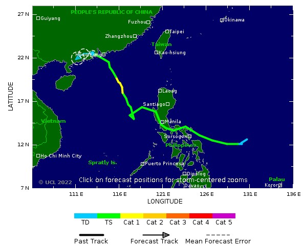 D'autres services, y compris le Joint Typhoon Warning Center, prévoient que la tempête se déplace vers le nord-ouest vers Hong Kong plutôt que vers l'ouest vers Hainan.