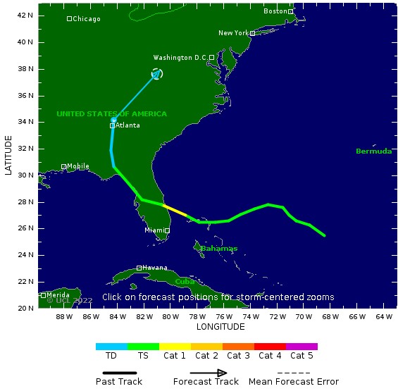 Nicole se changerta sa trajectoire ensuite vers le nord près ou au-dessus de la Floride avant d'être captée par un front froid qui tourne la tempête vers le nord-est sur les États du sud-est ou ses eaux côtières adjacentes en fin de semaine.