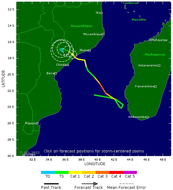 Après atterrissage au-dessus des terres, un affaiblissement rapide et attendu. Toutefois, le système demeurera une menace sérieuse en termes de précipitations pour le sud du Mozambique, le sud-est du Zimbabwe et l'extrême nord-est de l'Afrique du Sud selon le CMRS de La Réunion.