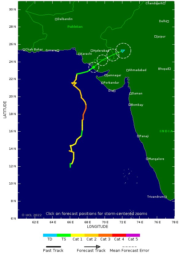 13/06 : Le système évolue en mer d’Arabie va finir sa course probablement à la limite de la frontière entre le Sud-Est du Pakistan et l’État indien du Gujarat. Le point d’impact est encore incertain. Mais il pourrait se faire près de Port Jakhau dans l’après-midi de jeudi.