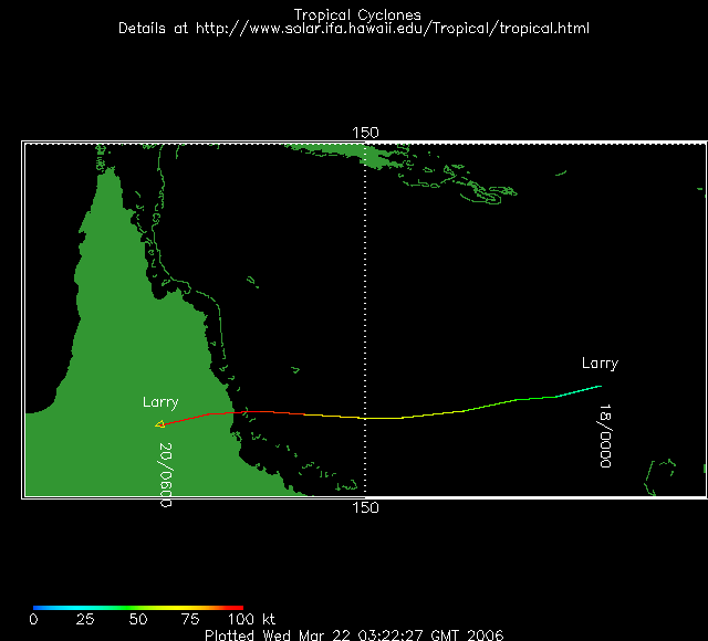 A l'heure actuelle Larry est situé à 240 km à l'Est des côte et se déplace à 25 km/h vers l'Ouest. Les vents destructeurs soufflent jusqu'à 120 km autours de l'oeil du système. D'ici sont atterissage sur la terre ferme, Larry devrait légèrement perdre de sa vigueur mais restera un cyclone extrêmement dangereux tant par les vents qu'il génère que par les fortes précipitations qui l'accompagnent.