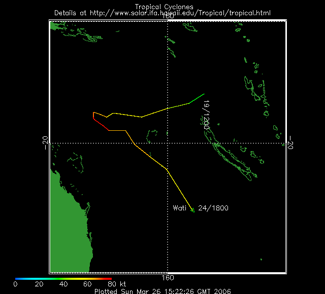 20 et 21/03 : Le cyclone Larry à peine passé, le N-E de l'Australie risque d'être de nouveau confronté à un nouveau système tropical tempêtuex. En effet, la tempête tropicale Wati vient de se former au large du Queensland et devrait toucher l'Australie d'ici 72 h.