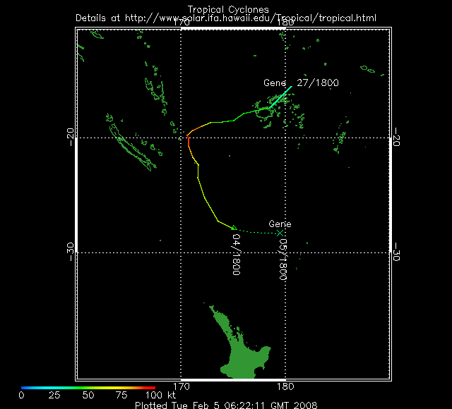 29 et 30/01: La tempête tropicale Gene qui a traversé l'archipel des Fidji où elle a fait 3 morts et des dégâts au cours des 36 dernières heures continu sa trajectoire vers l'Ouest en ce renforcant. Le système qui génère actuellement des vents moyens de km/h avec des rafales soufflant à km/h devrait atteindre le stade de cylone de catégorie 1 dans les prochaines heure et devrait affecté le Sud de l'archipel des Vanuatu.