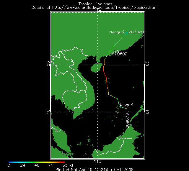 18/04: Neoguri s’est renforcé et est maintenant un typhon de catégorie 2/5 sur l’échelle de Saffir Simpson. Le typhon devrait toucher aujourd'hui l’île du Hainan puis toucher la province Chinoise du Guangdong.