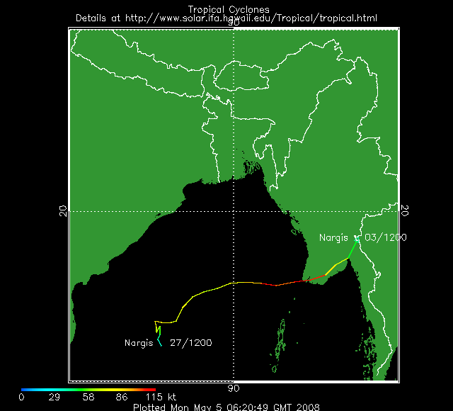 Le cyclone Nargis qui s'est formé au cours de ces dernières 48 h dans le Golfe du Bengale fait actuellement route vers le Nord-Ouest et devrait atterir sur les côtes Birmanes d'ici 72 h.