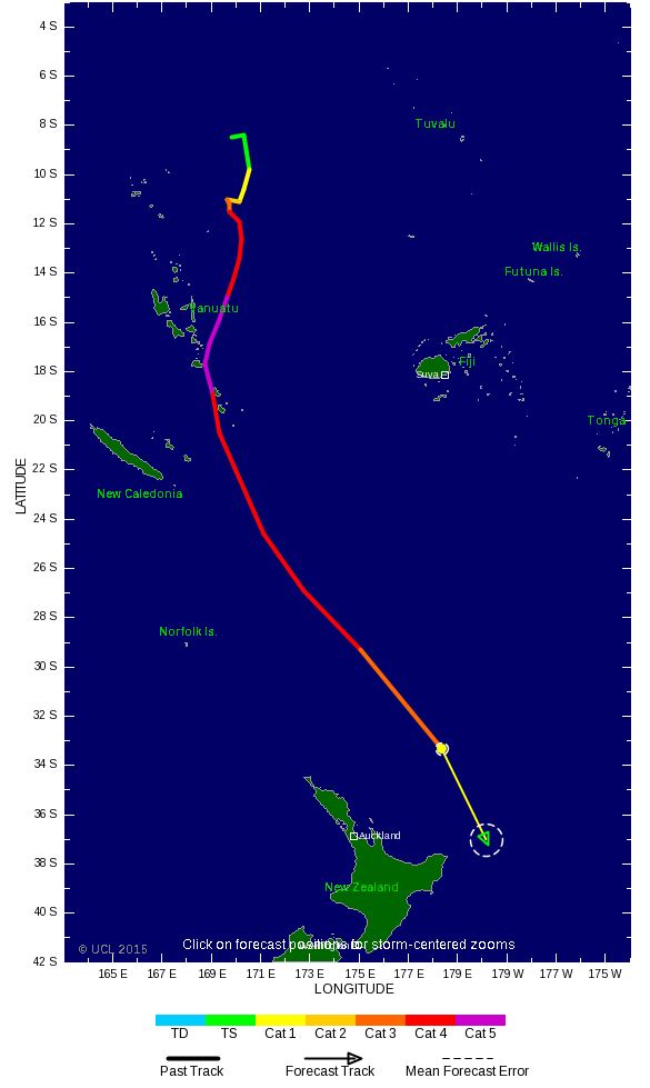 Le système se dirige vers le sud en se renforçant. Il devrait atteindre le stade maximal de cyclone de catégorie 5 d'ici 24 à 36 h. Des vents destructeurs à plus de 350 km/h seront alors possible près de l’œil en mer.A ce stade il passera au plus près des îles orientale de l'archipel des Vanuatu.