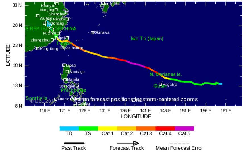 01/08: Le typhon "Soudelor" s'est formé au large des îles Guam il y a 48 h et se renforce rapidement. Le système atteindra la catégorie 4/5 (avec des vents soufflant à 200 km/h) d'ici mercredi en se dirigeant vers l'île d'Okinawa et potentiellement Taïwan le 06 ou 07 août prochain.