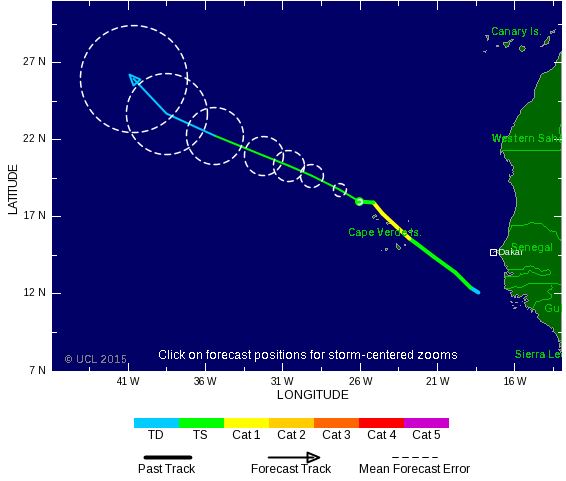 La tempête tropicale Fred s'est formée très à l'Est du Bassin Atlantique Nord au large des côtes Sénégalaises au cours de ces dernières heures. Le système déjà bien organisé fait route au Nord-Ouest en direction de l'archipel du Cap Vert en se renforçant.