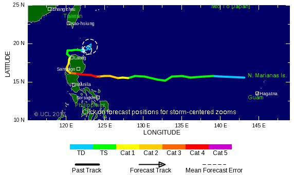 Ainsi, ce typhon de catégorie 4/5 frappe dès samedi l'île de Luçon. On attend jusqu'à 900 mm de précipitations sur le nord du pays (l'équivalent de deux ans de pluies à Orléans) car le phénomène persistera plusieurs jours sur cette même région. Par mesure de précaution, les autorités ont entamé l'évacuation de milliers d'habitants de la côte vers l'intérieur des terres, en raison d'une forte houle attendue, avec des vagues de 6 à 8 mètres. Des rafales de vent proches de 180 km/h sont possibles.