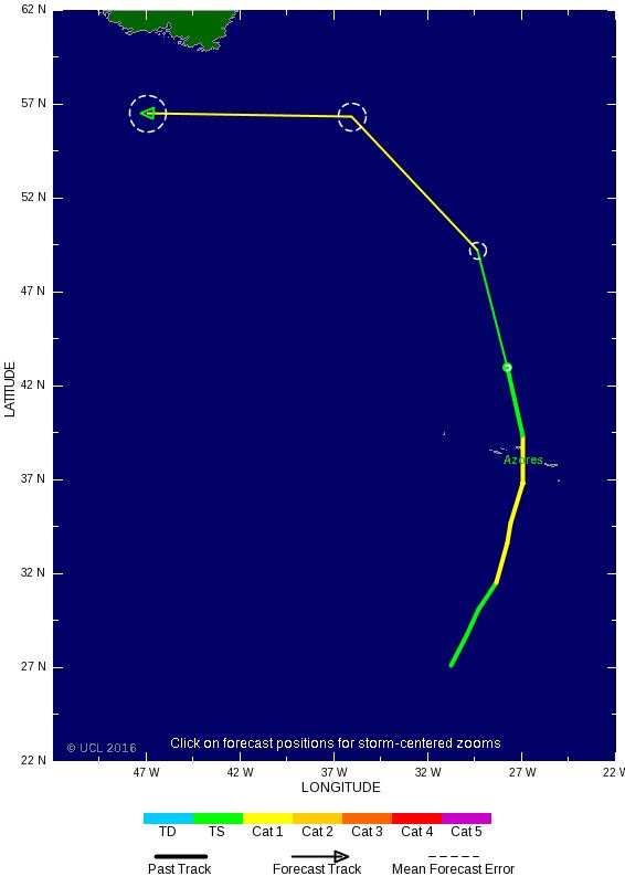 Alex fait route au Nord Nord-Est et génère des vents soufflant à 100 km/h. La tempête devrait incurver sa trajectoire au Nord puis au Nord-Nord-Ouest ce qui devrait l'amener à traverser l'archipel des Açores dans les prochaines 24 h sans toutefois se renforcer notablement. Outre les vents soutenus, le phénomène s'accompagne de très fortes pluies qui sont susceptibles de causé des inondations et des glissements de terrain.