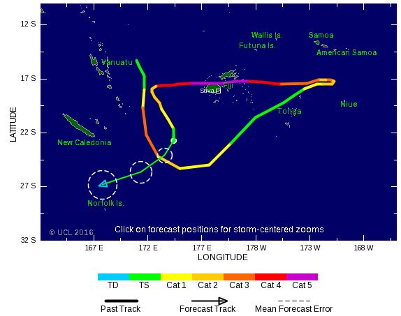22/02: après avoir touché les Fidji, le cyclone Winston a baissé d'intensité et a été rétrogradé en catégorie 3/5. Dans les prochaines heures il continuera à s'affaiblir en changeant de cap à plusieurs reprises. En effet, durant 24 h le cyclone va se diriger vers le Sud-Est pour incurver sa trajectoire au Sud-Ouest.