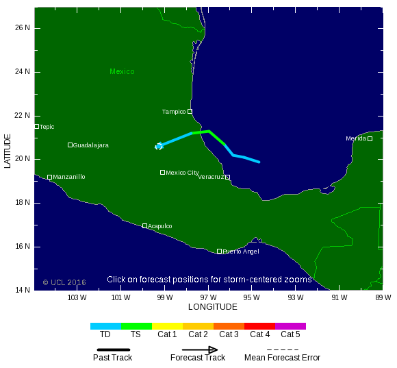 La dépression AL 04 s'est formée au large des côtes de la ville Mexicaine de Véracruz (Sud-Est du Mexique). Le système se dirige vers l'Ouest en se renforçant. Il devrait atteindre le stade de tempête tropicale (Danielle) juste avant de toucher terre d'ici 24 h. A cette échéance le système devrait générer des vents soufflant jusqu'à 90 km/h et de très fortes pluies susceptibles de causer des inondation et des glissement de terrain.
