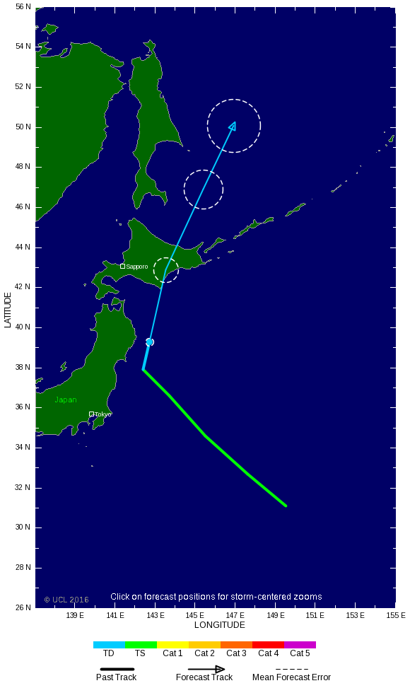 La tempête tropicale Kompasu s'est formée dans le Nord-Ouest du Pacifique Nord et fait route au Nord-Ouest en remontant vers le Japon. Le système qui génère des vents soufflant à 100 km/h ne devrait pas se renforcer en typhon mais va incurver sa trajectoire au Nord-Est à mesure de sa remontée en latitude ce qui lui fera toucher l'île septentrionale de Hokkaïdo dans 24 h. A cette échéance la tempête ne devrait être plus qu'une simple dépression tropicale.