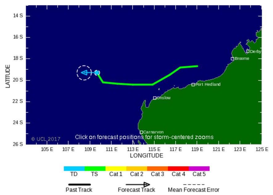 La dépression tropicale n°3 est proche de la côte nord-ouest de Kimberley en mer au large en Australie Occidentale et s'est transformé en tempête tropicale au nord de Pilbara. Le système qui génère des vents soufflant jusqu'à 95 km/h ne devrait pas toucher terre mais longer les côtes australiennes durant 24 h.