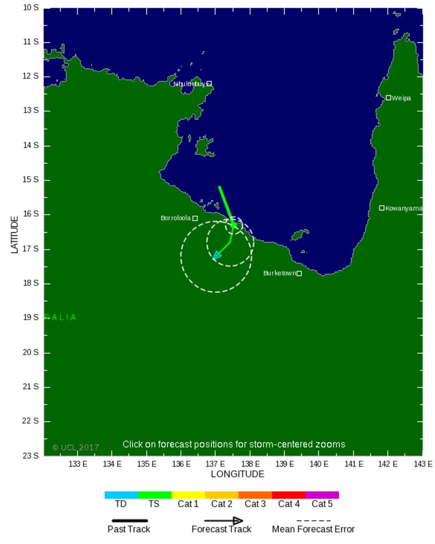 Alfred est situé à environ 130 km à l'est de la ville de Borroloola et se déplace lentement vers le sud-sud-est à 9 km/h. Ses vents moyens près du centre sont mesurés à 65 km/h, tandis que les rafales atteignent 95 km/h.