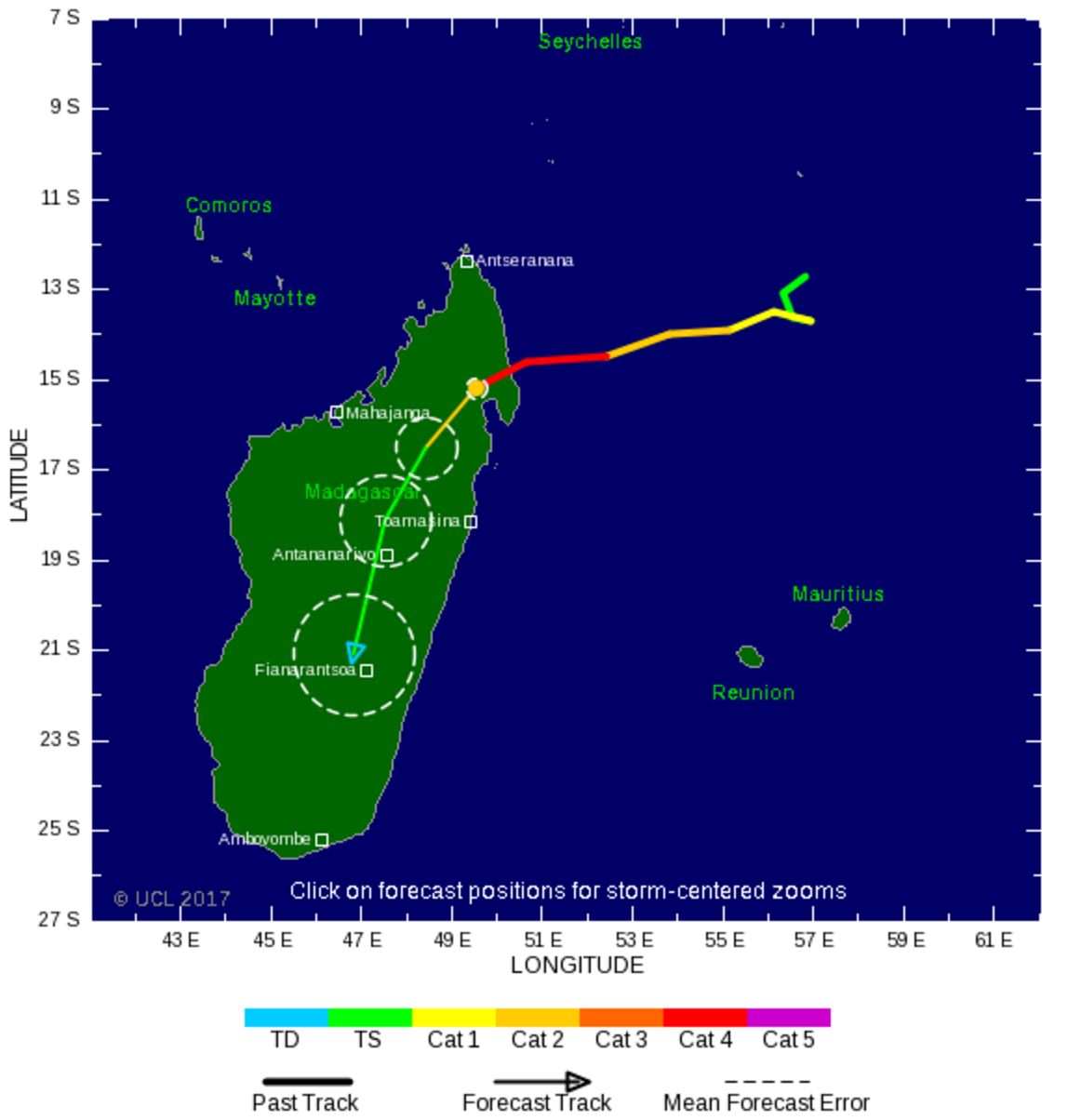 Enawo devrait s'intensifier en cyclone tropical dimanche puis en cyclone tropicale intense le lendemain avec des vents maximaux soufflant à 200 km/h. Le système devrait baisser un peu d'intensité avant de toucher l'Est de Madagascar à compter du 7 mars.