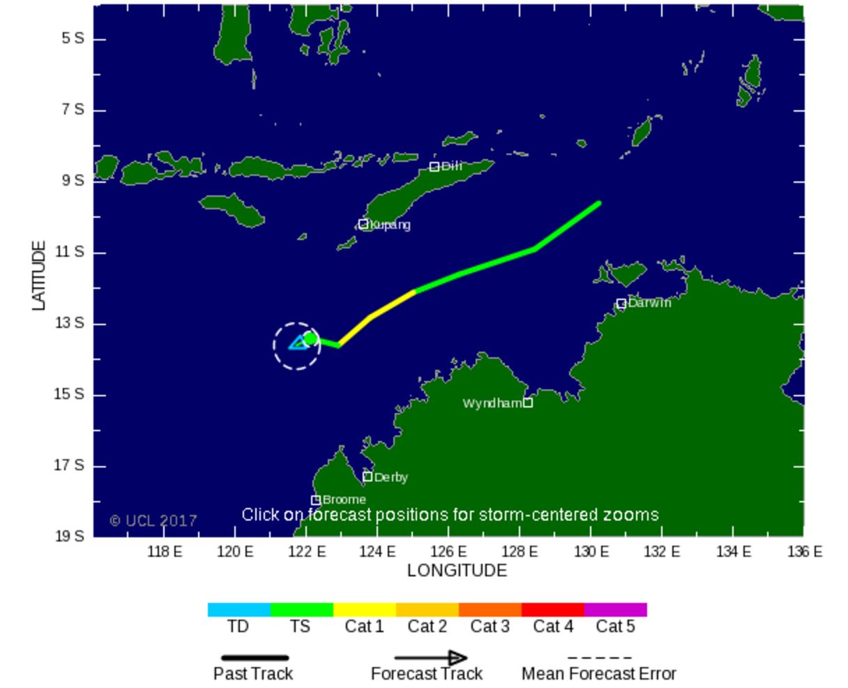 Le 27 avril 2017 à 11h15 locales le centre était localisé près de 11°0 S 128°3 E à 235 km W de Pirlangimpi et 410 km NNE de Kalumburu. Il fait mouvement WSW à 19 km/h. Le cyclone de catégorie 1 développe des vents près du centre de 85 km/h en rafales à 120 km/h.