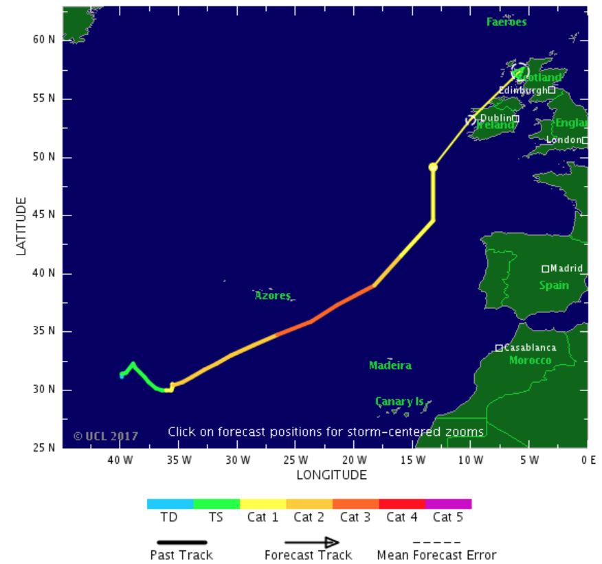 12/10: L'ouragan Ophelia qui s'est formé au niveau de l'archipel des Açores et est actuellement un cyclone de catégorie 2 avec des vents soufflant à 150 km/h. L'ouragan devrait remonter en latitude vers le golfe de Gascogne, le large de la Bretagne puis les îles britanniques en passant au large du nord-ouest de la France. Le système touchera l'Irlande puis l'Ecosse à partir du 16 octobre. A cette échéance Ophelia pourrait toujours être une tempête tropicale et apporter des vents forts et de fortes pluies.