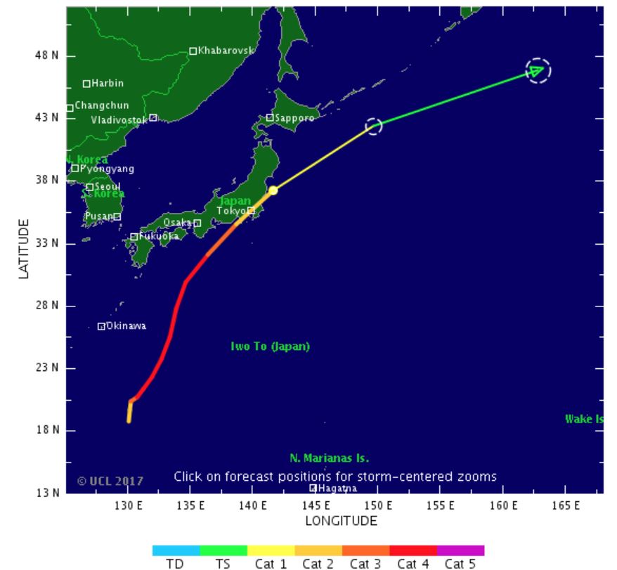 Par la suite, Lan va tangenter les côtes Sud et Est du Japon en perdant de la vigueur et pourrait impacter la région de Tokyo le 22 octobre. A cette échéance, Lan sera un typhon de catégorie 2 avec des vents à 150 km/h et de très fortes pluies.