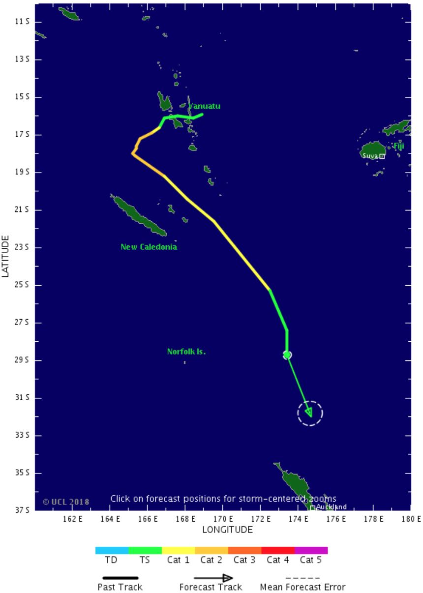 Dans les prochaines heures la tempête devrait s'évacuer de l'archipel des Vanuatu par l'Ouest avant d'incurver sa trajectoire au Sud-Sud-Est tout en se renforçant. D'ici 36 h Hola devrait s'être transformer en cyclone de catégorie 4 avec des vents soufflant jusqu'à 210 km/h. Hola devrait passer au large des côtes Est de la Nouvelle Calédonie et surtout à proximité des îles Loyauté alors qu'il sera à son intensité maximale.