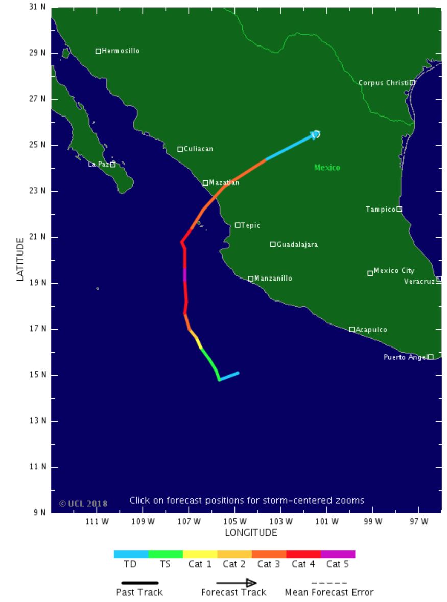 Cet ouragan pourrait toucher les côtes Mexicaine avec une intensité de cyclone de catégorie 2 le 26 octobre. Outre des vents très forts, le système va s'accompagné de très fortes pluies susceptibles de causer des inondations.