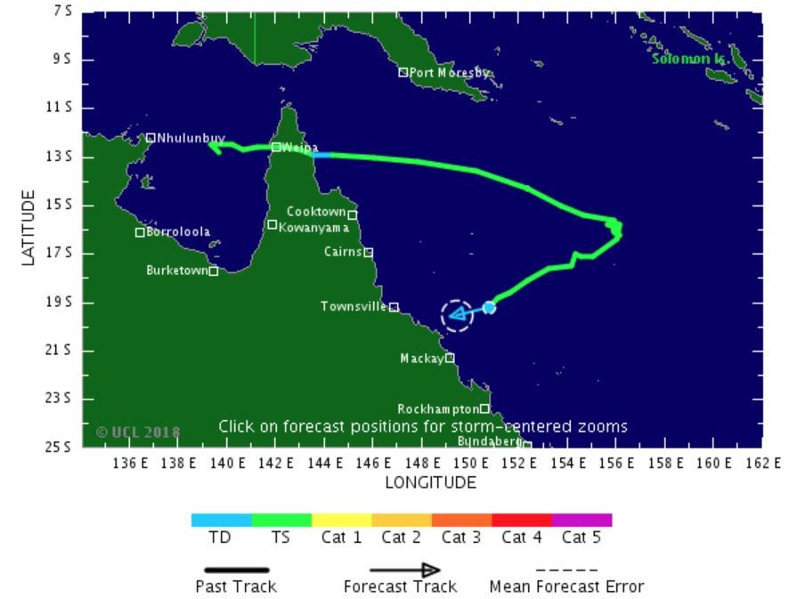 Toutefois, le cyclone pourrait ne pas se dissiper complètement et pourrait de nouveau viser le Queensland la semaine prochaine. Penny frappera la côte du Queensland entre Cairns et Clairview en tant que cyclone tropical de catégorie 1 [équivalent de tempête tropicale] ou dépression tropicale.
