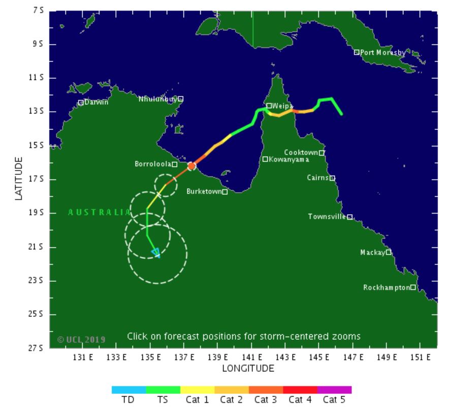 Le météore devrait traverser rapidement la péninsule d'Est en Ouest et ré-émerger dans le Golfe de Carpentarie dès demain. Après un affaiblissement significatif lors de son périple sur terre, une nouvelle ré-intensification est attendue dans le Golfe.